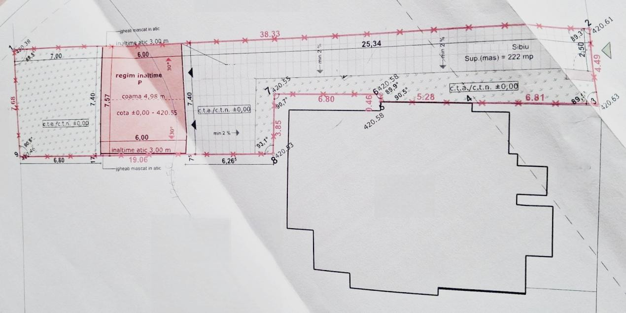 Terenul are Carte funciară individuală, frontul stradal de 4,5 m, lățimea maximă de 7,7 m și lungimea de 38 m.